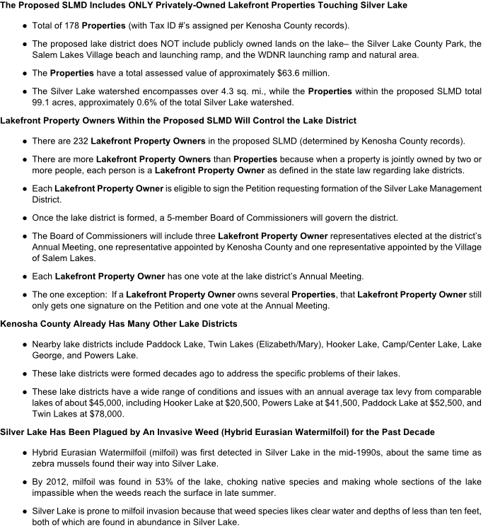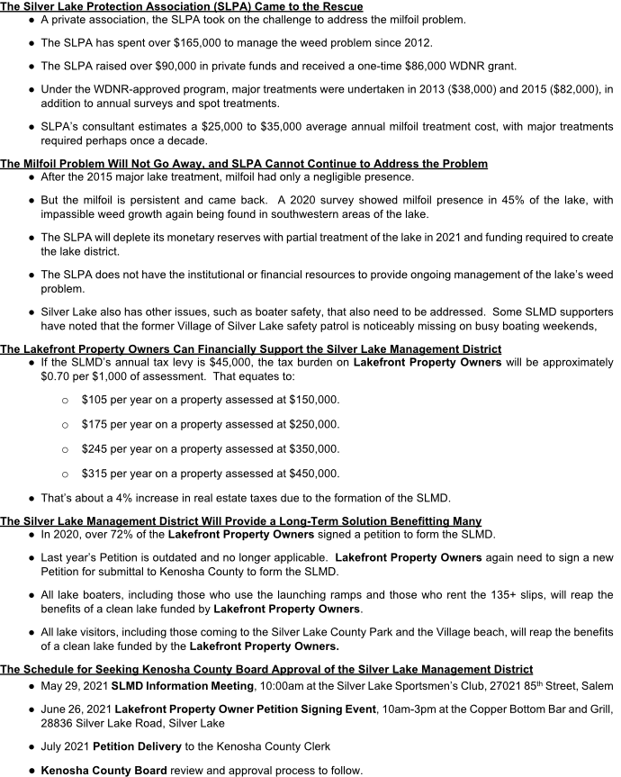 A. In the past, there were efforts to study the creation of a lake district for Silver Lake. The first public hearing saw opposition. A formal effort started in the summer of 2020, with the intent to only include lakefront property owners within the defined lake district. A clear super majority of lakefront property owners (over 72% responding to a registered survey) were willing to pay incremental taxes and would be the only property owners who would pay to keep the lake as pristine as possible, beginning with the weed overgrowth, which is choking large portions of Silver Lake.